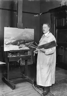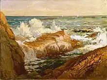 Gagen painted sea and river studies and travelled widely to do so, favoring the Maritime Provinces and the shore of St. Lawrence in Quebec as well as Maine and Massachusetts in the United States. In 1890, he painted the Rockies and the Selkirks and in 1906, Scotland and Switzerland.[2] In 1910, he returned to painting the St. Lawrence.[2] In 1918, the Canadian War Memorials Fund asked him to record the shipbuilding underway in Toronto, Ontario.[6] He exhibited his work in the many societies of which he was a member almost every year from the time he joined them. In 1927, a year after he died, there was an exhibition and sale of his work at Eaton's.[7] His work is included today in exhibitions of Canadian art, such as Stone and Sky: Canada’s Mountain Landscape, at the Audain Art Museum in Whistler, B.C. in 2018[8] and is in many collections such as the National Gallery of Canada[1] and Art Gallery of Ontario.[9]