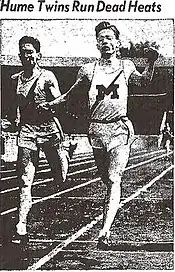 The Hume twins' practice of interlocking hands in "dead heat" wins drew national publicity and also controversy. Associated Press columnist Jimmy Jordan dubbed them the "dead heat twins."[6] Another writer referred to them as the "Dead Heat Kids."[7] The publicity peaked in June 1944 when "Michigan's famous distance running twins raced to their ninth straight dead-heat victory in the mile run of the 23rd National Collegiate Athletic Association track and field championship meet tonight, finishing hand-in-hand more than 100 yards ahead of the next runner."[8][9] A columnist in Massachusetts wrote: