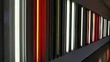 Irwin first used fluorescent light in the 1970s.[5] His site-conditioned installation Excursus: Homage to the Square3, a meditation on the painter Josef Albers and his explorations of color relationships,[6] was presented at Dia:Chelsea between 1998 and 2000. It consists of 18 small rooms, divided by walls of tautly stretched scrim; the light in each room, its value depending on the distance from the windows, is enhanced by four white-and-colored double fluorescent bulbs, each hung vertically at the center of each wall.[6] In 2015, it was reinstalled at Dia:Beacon where it was on view through 2017.[5] For a 2015 exhibition at Pace Gallery in New York City, Irwin installed rows of columnar lights, coating the different tubes with colored gels that alter the transmission of light.[5]
