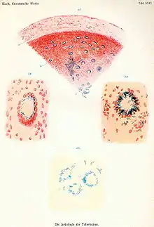 By November 1890, Koch was able to show that the extract was effective in humans as well.[54] Many patients and doctors went to Berlin to get Koch's remedy.[15] But his experiments showed that tuberculosis infected guinea pigs developed severe symptoms when the substance was inoculated. The severity was more so in humans.[44] This development of severe immune response, which is now known to be due to hypersensitivity, is known as the "Koch phenomenon."[55] The chemical nature was not known, and among several independent experiments done by the next year, only his son-in-law, Eduard Pfuhl, was able to reproduce similar results.[5] It nevertheless became a medical sensation, and the unknown substance was referred to as "Koch's Lymph." Koch published his experiments in the 15 January 1891 issue of Deutsche Medizinische Wochenschrift,[56][57] and The British Medical Journal immediately published the English version simultaneously.[58] The English version was also reproduced in Nature,[59] and The Lancet in the same month.[60] The Lancet presented it as "glad tidings of great joy."[54] Koch simply referred to the medication as "brownish, transparent fluid."[16] Josephs Pohl-Pincus had used the name tuberculin in 1844 for tuberculosis culture media,[61] and Koch subsequently adopted as "tuberkulin."[62]
