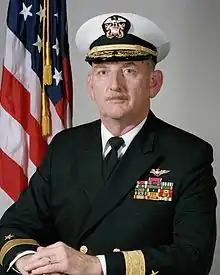 Robert Lee Leuschner Jr. (March 13, 1935 – July 19, 2016) was a rear admiral in the United States Navy. He was Commander of the nuclear-powered carrier USS Enterprise from 1983 to 1986.[1][2] A native of Texas, he was born in Waco, and later moved with his family to San Diego, California, where he graduated from high school. In 1953, he was admitted to Rice Institute in Houston, where he enrolled in the chemical engineering curriculum. He also joined the Naval Reserve Officer Training Corps (NROTC), so that immediately after receiving his bachelor's degree, he was also commissioned as ensign in the U.S. Navy.