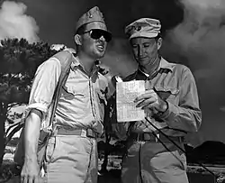 Keller (left) during the interview with a Marine radio-correspondent on Okinawa, June 1945.
