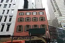 The Robert and Anne Dickey House, also referred to as the Robert Dickey House[3] or by its address 67 Greenwich Street, is a Federal-style building in the Financial District of Lower Manhattan in New York City. The site is bounded by Edgar Street to the south, Greenwich Street to the west, and Trinity Place to the east. It is named after Robert Dickey, a 19th-century New York merchant, and his wife Anne, who both resided in the house.[2][3] Erected circa 1810, it is one of the few remaining Federal-style buildings in the city,[2] and became a New York City designated landmark in 2005. Having stood for over 200 years, surviving the construction of several subway lines and the Brooklyn–Battery Tunnel, as well as the September 11 attacks, the building has been labeled as a "Robert Moses survivor" and "The Indestructible Townhouse".[4][5]