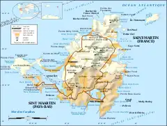 Poincy then sent 300 men under Robert de Lonvilliers, governor of Saint Christophe, who landed without meeting resistance.[20] The French and Dutch ratified a treaty on 22 March 1648 on a hill that became called the "Mont des Accords".[21] The Treaty of Concordia was signed by the two governors of the island, Robert de Longvilliers for France and Martin Thomas for the States General of the Netherlands. The French would keep the area they occupied and the coast facing Anguilla, while the Dutch would have the area of the fort and the land around it on the south coast. The inhabitants would share the natural resources of the island.[22]