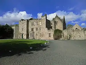The Hall dates to the 12th or 13th century. The south wing was converted into a defensible tower house in the late 14th or early 15th century, the whole was remodelled in the 17th century, but the house was left ruinous by a fire in 1752, before being restored and extended by Charles Bosanquet in the 19th century.[2]