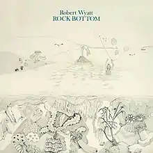 Rock Bottom has been released with two different covers, both featuring artworks by Benge. The cover found on the original LP and several reissues is a pencil drawing of a scene at an ocean shore. The upper area of the cover, inspired by a Victorian-era book cover, depicts activity along the beach and off to the horizon, while the bottom third gives an underwater view of strange animal and plant life in the sea.[6] Details include three teenage girls playing at the beach,[7] a faraway steamer, seagulls and sandcastles.[6] Benge intended the cover's subdued style to strike a contrast with the dominant trend of fantastical progressive rock album art, best typified by Roger Dean's science fiction-inspired artwork for Yes.[6] At a time when "all the covers were getting more and more complicated, competing with each other for pizzazz", Benge said, "the only way to counter that ... was to be absolutely minimal and quiet."[6]