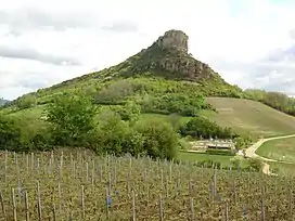 The Rock of Solutré (French: Roche de Solutré) is a limestone escarpment 8 km (5.0 mi) west of Mâcon, France, overlooking the commune of Solutré-Pouilly. It is an iconic site in the department of Saône-et-Loire, in Bourgogne-Franche-Comté.
