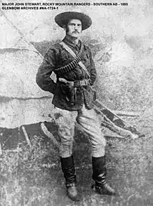 Commanded by John Stewart, a rancher turned militia officer from the Fort Macleod area, the RMR was a microcosm of local citizens, stockmen, trappers, politicians and discharged Mounties hammered into an irregular cavalry unit.[4]