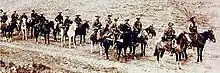 A Rocky Mountain Ranger patrol formed up near Medicine Hat. Heading up the column, on the extreme right, is Chief Scout "Kootenai" Brown, with Captain Lord Richard Boyle beside him.