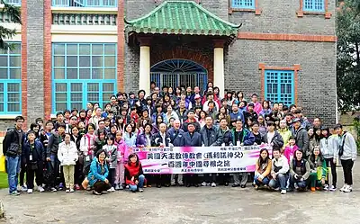 A group photo of the students of the five Maryknoll Fathers schools from Hong Kong in front of the Immaculate Heart of Mary Cathedral at No. 67 Hai Bang Road, Bei Jie, Jiangmen, where Bishop Adolph J Paschang used to serve. Right in the middle of the front row is Fr Liang Jian-sen who is now Bishop of the Catholic Diocese of Jiangmen. Photo taken on 19 March 2011.
