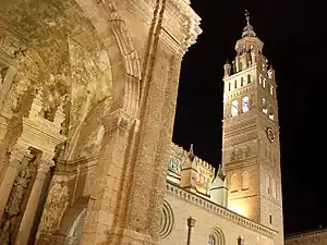 The Church of the Magdalene was the ancient cathedral, but the Moors, objecting to its prominent position, compelled them to use a church on the outskirts of the town. In the records left by Miguel this was variously called Santa Maria de la Hidria, de la Vega, or de la Huerta, on account of its position. It was endowed by Teresa Cajal, mother of Pedro de Atarés and wife of García Sánchez, and was begun in 1152.