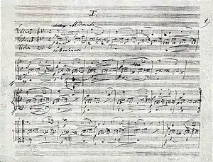 The composer's family was living in that time in Prague 2, at 564 Žitná Street, in the same house as Dvořák's mother-in-law. She hired out a room to a young chemistry student, Josef Kruis. Kruis was also an amateur violinist who studied the violin with Jan Pelikán, a member of the orchestra of the National Theatre in Prague.[1] They often played violin duets together. Dvořák, a viola player, heard them and got the idea to compose a new chamber work for two violins and viola in order to play with them.[1] The resulting composition was the Terzetto in C major, Op. 74, B. 148, composed from 7 to 14 January 1887. It was, however, too difficult for Kruis, and Dvořák therefore composed another trio, but considerably simpler.[1] The second trio, Miniatures, was written in four movements, which he titled: "Cavatina", "Capriccio", "Romance" and "Elegy" ("Ballad"). In the letter dated 18 January 1887 to his German publisher Simrock, Dvořák stated: "I am writing little miniatures – just imagine – for two violins and viola, and I enjoy the work as much as if I were writing a large symphony – what do you say to that? Of course, they are meant rather for amateurs, but didn't Beethoven and Schumann also express themselves sometimes with quite simple means – and how?..."[1] Though he was apparently satisfied with this version of the trio, he nevertheless immediately began to rearrange it for violin and piano. He called the new version Romantic Pieces, Op. 75. The only date appears at the end of the manuscript – 25 January 1887. Dvořák later completely forgot about the existence of the trio, and years later in 1901 explained to Simrock that "...what is supposed to be a trio...cannot be the Romantic Pieces".[1] Dvořák's original manuscript of the trio version (and Kruis' copy of individual parts) was only rediscovered in 1938, and it was proven that he himself was mistaken.[1]