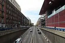 On 25 January 1980, during the municipal government of Enrique Tierno Galván,[n. 1] the City Council voted in favour of returning the name of the thoroughfare back to "Ronda de Atocha" along a wider change of another 26 street names connected to the Francoist dictatorship or the Civil War.[9] Meanwhile, the dismantling of the "scalextric" started in 1985.[7] Works were completed in 1986.[10]