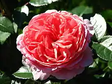 The rose is described as a very double apricot flower. It has an old fashioned, quartered bloom form with up to 100 petals, and a light, spicy fragrance.[1][4] The colour is weather dependent, reaching from deep orange to soft pink. The buds open slowly to medium-sized flowers with a diameter of 8 to 10 centimetres (3.1 to 3.9 in), are well suited as cut flowers and appear abundantly in flushes throughout the season.[5]
