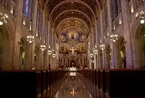 The main altar is carved from black Marquina Florido marble, imported from Spain, and, before the renovation, was covered with an oak baldachin supported by marble columns. The pulpit is carved from white oak by German artisan August Schmidt. Around the apse are statues of the eight authors of the New Testament. Each statue stands under a carved flèche.[2][3]