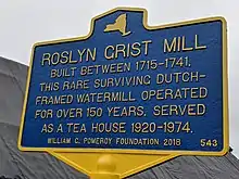 The Roslyn Grist Mill is located along Old Northern Boulevard in Roslyn, New York, United States. It was built sometime before the mid-18th century and is one of the few surviving Dutch colonial commercial frame buildings in the U.S.[2] Added to the National Register of Historic Places in 1986, it is currently being restored for use as a museum.