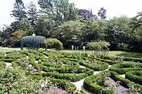 A circular driveway leads up to the house, set back a mere 40 feet (12 m) from the street to allow for outbuildings and the property's garden.[1] It includes elements of all three of its periods of private ownership: a formal boxwood rose parterre garden with tall calla lilies, boxwood specimen garden, cutting garden and Woodland Walk surrounding a 19th-century wooden latticework pergola.[5]