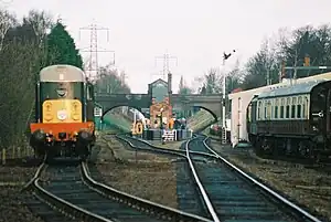 Climbing south from milepost 97, the formation of the Mountsorrel quarry branch joins the line from the east, crossing over the quadruple spanned bridge 352 to reach Swithland Sidings. Here, the up and down lines have parted as this site was originally to be the location of a projected Swithland station. The entrance archway from the road below can still be seen from passing trains, even though a platform was never built.[1] Swithland has been redeveloped from a single track back into a four-track main line with a number of exchange sidings. Resignalling of the area using Great Western equipment to represent the Great Western and Great Central Joint Railway is ongoing.