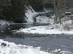 • 6.5 km (4.0 mi) first towards the west on 1.9 km (1.2 mi) in the marsh area to a bend of the river corresponding to the discharge of a stream (coming from the north -Where is); then south in an increasingly steep valley, crossing two series of rapids, to its mouth.[2]