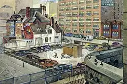 For many years she shared an apartment with Natalie Smith Henry at the Lambert Tree Studios building, and Henry depicted her in the watercolor Rowena Washing Her Hair sometime during the 1930s.[3] Fry went to Malvern, Arkansas to live with Henry later in life.[4] She died there, survived by two sisters,[5] and is buried in the town's Oak Ridge Cemetery; her grave marker gives a date of birth of October 27, 1900.[6] Fry's work is in the collection of the Illinois State Museum.[1] A collection of the two women's papers was digitized by the Archives of American Art at the Smithsonian Institution.[4]