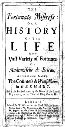 Roxana: The Fortunate Mistress (full title: The Fortunate Mistress: Or, A History of the Life and Vast Variety of Fortunes of Mademoiselle de Beleau, Afterwards Called the Countess de Wintselsheim, in Germany, Being the Person known by the Name of the Lady Roxana, in the Time of King Charles II) is a 1724 novel by Daniel Defoe.