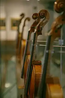 The academy holds a collection of more than 200 stringed instruments from the violin family. These have been acquired for the benefit of students and recent leavers and they are maintained by the academy's resident luthier. The collections include several instruments of the Stradivarius family, including the Rutson (1694), Kustendyke (1699), Viotti-ex-bruce (1709), Maurin (1718), and the Habeneck (1734), violas Archinto (1699), cello Marquis de Corberon-ex-Loeb (1726). Other instruments include Nicolo Amati violin (1662), Girolamo II violin (c.1671) and violin (1719), violin by Antonio and Girolamo Amati (1629) and a Hieronymus Amati violin (1719).[12][6][13] In 2005 the academy acquired the famous "Viotti ex-Bruce" violin, made by Stradivarius in 1709, on behalf of the nation.[14]