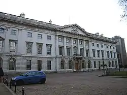 The long façade of the three-storey rectangular stone building has windows with Doric order running through the first and second floors. Above is a broad central pediment which displays the royal coat of arms engraved in stone with six columns below. The end bays are decorated with four pilasters.[103] Due to its historic significance, the building became Grade II* listed on 27 September 1973.[104]