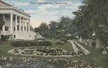 The Royal Palm Hotel was a large resort hotel built by railroad magnate Henry Flagler in Miami, Florida. Opened on January 16, 1897,[1] the Royal Palm Hotel was one of the first hotels in the Miami area. It sat on the north bank of the Miami River where it overlooked Biscayne Bay. Five stories tall with a sixth-floor salon, the Royal Palm Hotel featured the city's first electric lights, elevators and swimming pool. Almost thirty years later, The Royal Palm Hotel was grievously damaged by the 1926 hurricane, and infested with termites. In 1930, it was condemned and torn down.[2]:187