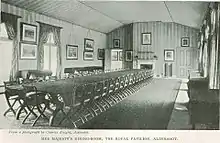 Its pine wood walls were painted white and the shutters on either side of each window were painted green.[9] The Pavilion's interior walls and ceilings were made of canvas stretched over a wooden frame and papered over. The building had a breakfast room, drawing room, large dining room with salon and a study for Prince Albert.[1] There were four large bedrooms - one each for Albert and Victoria and two more for important guests.[10]