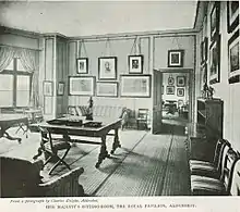 On 16 June 1855 Queen Victoria made her first visit to the Royal Pavilion and, following an inspection of the Camp took refreshments in the Pavilion. Her first stay there was in April 1856 on the occasion of her inspecting 14,000 troops at Aldershot.[1] Queen Victoria "was delighted with [the building's] simplicity, the charming views from its windows and its seclusion" and she painted some of these views during her visits to Aldershot.[7] A writer for The Illustrated London News, however, was less enthusiastic, writing of the Pavilion that "The design was of three sides of a square - bald, cold and ugly to an extreme. The whole Pavilion is built entirely of wood - not a single brick has been used in its construction."[8]