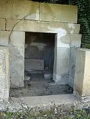 This tomb is on two levels. The upper level is a rock cut exedra as an Ionic hemicycle, with eight pilasters whose capitals were made separately flanking the entrance. To the left there is a niche with a relief engraved with a Bucranium and a helmet of the Pergamene type. To the right is a relief of an Illyrian-Macedonian shield. The floor of the tomb had a mosaic, but nothing of this remains. The door, which would have been sealed, leads to a narrow chamber. Gilkes[6] considers that this chamber may have been abandoned due to the irregularity of the rock, and that the chamber below may have been cut as a result. A fault in the rock, and rough pick marks, are visible. The second chamber has a high barrel vault and contained two beautifully carved sarcophagi in the form of couches. 10 burials were recovered from this chamber, some in the sarcophagi and others in the floor. A second burial period is attested. These date to the last decades of the 3rd century and produced many grave goods, now on display in Tirana. Some scholars believe that this may have been the tomb of a royal family or dynasty. Among the grave goods are golden earrings, necklaces, pins, rings, all of the Hellenistic type, belt fittings, iron, a silver ornament depicting a battle scene, armour, spear points and 30 ceramic vessels.[7]