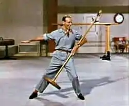 • "Sunday Jumps": Astaire parodies himself by dancing with a hatrack. The fame of the dance rests on Astaire's ability to animate the inanimate. The solo takes place in a ship's gym, where Astaire is waiting to rehearse with his partner Powell, who doesn't turn up, echoing Adele Astaire's attitude toward her brother's obsessive rehearsal habits to which the lyrics (unused and unpublished) also made reference. In 1997, Astaire's widow Robyn authorized Dirt Devil to use a digitally altered version of the scene where Astaire dances with their product in a commercial; Astaire's daughter Ava objected publicly to the commercial, stating that they had "tarnish[ed] his image" and it was "the antithesis of everything my lovely, gentle father represented"[7]