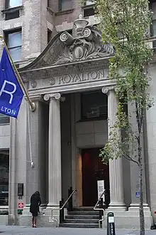 Bailey sold the Royalton to the estate of Frederick Billings in September 1901, and the estate assumed the hotel's $675,000 mortgage.[46] By the late 1900s and early 1910s, the surrounding neighborhood was rapidly developing into an entertainment district.[47] The New York Hippodrome opened directly adjacent to the Royalton in 1905,[48] and several Broadway theaters had been developed on 44th Street in the 1900s and 1910s.[10] With the development of these attractions, the Royalton began serving theatrical guests as well.[4] The hotel also hosted clubhouses in the early 1910s, such as that of Phi Gamma Delta.[49] Joseph Shenk was negotiating to acquire the Royalton in November 1919, with the intention of converting the hotel into offices;[50] at the time, the hotel collected $200,000 per year in rent.[5][51] The planned conversion did not happen, and Quinlan and Leland placed a $550,000 first mortgage loan on the Royalton in 1927.[52][53] The hotel contained a music store by 1930.[54]