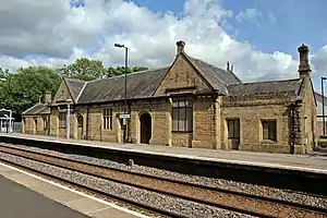 The original station building was Italianate in style and was designed by the architect Thomas Penson and opened on 4 November 1846.[4] However, this was replaced by the current neo-Tudor style stone buildings,[5] designed by Henry Robertson, in 1860. In 1870, refreshment rooms were added between the platforms serving Chester and Barmouth.[4]