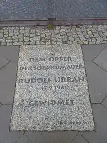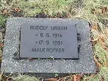 Rudolf Urban was the fourth known of at least 140 victims caused by the Berlin Wall, in order of death, but was the first known victim in order of attempted escape. He was buried at the Dorotheenstädtischer Friedhof II.[5][4] A memorial stone on the Bernauer Straße, near the Swinemünder Straße, which the district office of Wedding 1982 had set up, commemorates his fate and the fate of nine other victims in Bernauer Strasse. His widow, Ilse Urban, was last known to live (in 1985) at Teikeweg 42, in Berlin-Mariendorf.[1][6]