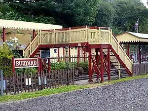Rudyard railway station served Rudyard, Staffordshire and was opened by the North Staffordshire Railway (NSR) in 1850 on the Churnet Valley line.[2] In the village the NSR also owned the Rudyard Hotel as part of the company's efforts to develop Rudyard Lake and its environs as a tourist destination.