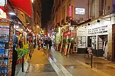 The rue de la Huchette is one of the oldest streets running along the Rive Gauche in Paris, France. Running eastward just below the Seine river from the Place Saint-Michel, it is today an animated Latin Quarter artery with one of the highest concentrations of restaurants in the city, Greek specialties predominating. It is situated between Boulevard Saint-Michel and Rue du Petit-Pont and faces the cathedral of Notre-Dame de Paris. This almost exclusively pedestrian street is very popular with tourists. Disdained by some guidebooks as "Bacteria Alley", the street nevertheless has an intense night life with no fewer than four pubs and several bars.