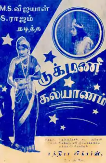 Rukmani Kalyanam (transl. Rukmani's marriage) is a 1936 Indian Tamil-language Hindu mythological film produced and directed by Bhalji Pendharkar. It stars S. Rajam as the Hindu god Krishna and M. S. Vijayal as his wife Rukmani.[2]