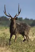 Rusa unicolorSambar, Indian sambar-deer, Malayan sambarMost of the temperate, subtropical & tropical Indian subcontinent south of the Himalayas (incl. Bangladesh, Nepal, Sri Lanka), mainland Southeast Asia (incl. Cambodia, Laos, Malaysian mainland, Myanmar, edges of Singapore, Thailand, Vietnam), Brunei, Indonesia (Borneo, Sumatra), southern China (including Hainan Island) and Taiwan.