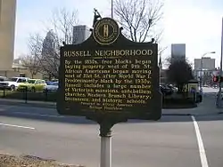 By the 1940s Russell had become "Louisville's Harlem" as African American theaters, restaurants, and night clubs lined area streets.[1] However, in the years following World War II many of the middle class blacks left for newly integrated neighborhoods on the south and east ends. Urban renewal efforts in the 1960s had the area's business districts razed and many public housing units built. America's first public library open to African-Americans is in Russell. The Western Branch of the Louisville Free Public Library, on 10th Street off Chestnut, opened in 1908.