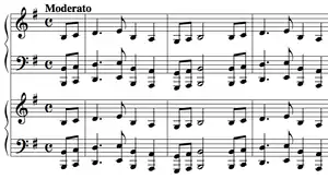 While still a student at Moscow Conservatory, Rachmaninoff wrote to Natalia Skalon on January 22 [O.S. January 10] 1891 mentioning that he had begun work on a piece for two pianos that he wanted to play with his first cousin Alexander Siloti.[3][4] He dated the manuscript January 1215, 1891 [O.S., implying that he had the composition in his head at the time of the letter, and only recorded the days he notated it on paper. Despite his stated intentions, he began rehearsing with Leonid Maximov, who had been a fellow student of Nikolai Zverev and pupil of Siloti, to play at a student concert at the Conservatory on March 8, 1891. However, Zverev, still upset over Rachmaninoff's request for a separate composing room, did not allow them to play together, so at the concert Rachmaninoff ended up conducting his choral work Deus Meus (1890) instead.[1] The Rhapsody received its first performance after he graduated, on October 29, 1891, played by Rachmaninoff and Josef Lhévinne at the Conservatory.[2]