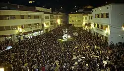 The Ruta del Tambor y el Bombo (literally "Drum and Bass Drum Route") is a celebration of Easter and the Passion of Christ that takes place in nine towns in south-eastern Aragon (Spain), in the province of Teruel: Albalate del Arzobispo, Alcañiz, Alcorisa, Andorra, Calanda, Híjar, la Puebla de Híjar, Samper de Calanda and Urrea de Gaén. During the Holy Week, a number of residents of those towns wear a special tunic and play either the drum or the bass drum at specified moments, also marching during processions. The combination of all the drums playing simultaneously creates a remarkably loud din.