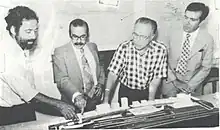 Architect Eurico Prado Lopes (left) presenting the model of the São Paulo Cultural Center to municipal secretaries Mário Chamie (culture) and Paulo Gomes Machado (works), 1979.