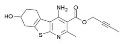 SB-205384 is a GABAA positive allosteric modulator, which binds preferentially to α3, α5, and α6 subunit containing subtypes.[1][2] It has a novel mechanism of action, prolonging the duration of GABA-mediated chloride flux but without increasing the intensity of the response, and this may give it an unusual pharmacological profile,[3] with tests showing that it alters the firing of some populations of neurons while leaving others unaffected.[4] Animal studies have shown it to produce both anxiolytic and anti-aggressive effects, but with little sedation or other behavioural changes.[5][6]