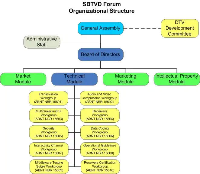 The SBTVD Forum is the recognize entity for discussions and meetings about Digital TV in Brazil, and also play the role of technical consultant to the Brazilian Digital TV Development Committee, a governmental group responsible system regulation. There are four different Modules that addresses topics from separate perspectives: a Technical Module, a Marketing Module, an Intellectual Property Module and a Market Module.