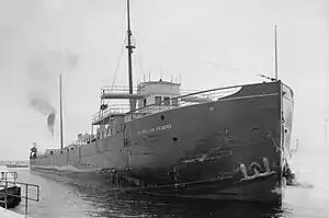 On August 13, 1896, the Cleveland based newspaper, The Marine Record, reported that she would probably be delivered to her owners on August 25, 1896.[29] Inland Lloyd's valued her at $240,000 (equivalent to $7.3 million in 2022[30]) and gave her an insurance rating of A1; her home port was Duluth, Minnesota.[31] She was struck by the monitor Andaste while still at the Globe Iron Works Company on the evening on August 20; Sir William Siemens was repaired at a cost $1,500 (equivalent to $45,619 in 2022[30]).[32] Her maiden voyage began when, following a short trial trip, she left Cleveland at night on August 25, passing Detroit, Michigan, after an eight hours at 8:00 a.m.; The Marine Record described her speed as "very unusual for a ship with brand new machinery".[32][33] Her first cargo was 4,030 long tons (4,095 t) of iron ore, with an average draft of 14 ft 6.5 in (4.4 m).[33] On a trip from Duluth to Buffalo, New York, in November 1896, Sir William Siemens broke the record for the largest cargo of wheat ever carried from a Lake Superior port at 174,500 bushels or 5,235 long tons (5,319 t) of wheat.[34][19][35][36] She broke the record again later in November, hauling 177,000 bushels or 5,310 long tons (5,395 t) of wheat.[37][38]