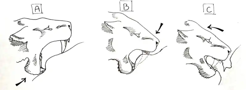 A sequence diagram of the shearing bite in the machairodont Homotherium serum: Diagram A depicts the machairodont pressing its lower canines and large incisors into the belly of the prey, creating a fold with the upward motion. Diagram B depicts the skull being depressed by the muscles of the neck, piercing the skin. Diagram C depicts the jaws clamped firmly around the section of skin and fat, and with incisors gripping the skin, the machairodont is pulling back, tearing the flap of skin from the belly.