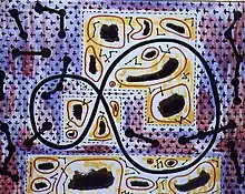 Around 1951, Hasegawa stopped working in oil painting and instead devoted himself to creating prints and ink paintings, and to exploring photography through photograms. Some of his ink paintings from this time closely approached avant-garde calligraphy practiced by calligraphers such as the members of the group Bokujinkai in the 1950s. Avant-garde calligraphy focused on the form of ink lines but often resulted in abstract art rather than conveying any legible characters.[21] Hasegawa's paintings from this time thus merged the gesturalism of Japanese calligraphy with the spontaneity of postwar Western gestural abstraction.[22] Hasegawa also created paintings in ink wash. His prints were monotypes in watercolor, gouache, or ink, made with kamaboko-ita (rectangular pieces of wood used to steam kamaboko, or fish cakes, in Japan) and funaita (ship planks) as the printing blocks. He also created ink rubbings, and mixed media pieces that combined any of the above techniques.[23]