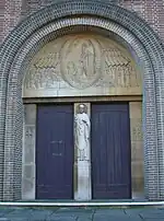 The church was designed by the architect C. M. Hadfield (of Hadfield & Son) and was constructed from specially made thin red bricks with an unusual surface texture. The external brickwork facing is unusual in that it employs Monk bond coursing which is rarely used. It has been called "one of the best interwar churches in Sheffield". Originally, the church had just one large bell supplied by John Taylor Bellfounders of Loughborough. It weighs over one ton and is in the tone of "D". In 1948 the bell tower was strengthened and a peal of smaller bells was added by the same company to complement the tenor bell. The bells are played in the manner of a carillon. The sculptor Philip Lindsey Clark (1889–1977) carved the 14 Stations of the Cross which are arranged around the internal walls, his other contributions are the statue of the Sacred Heart at the main door and the carvings in the tympanum above the door which is made of Portland stone. The tympanum depicts scenes from a pilgrimage to Lourdes and the figure in the water may be that of Alfred Wood, a parishioner who was cured of his paralysis during a pilgrimage in 1930.[4] Canon Dunsford and the architect are depicted in the tympanum among the pilgrims.