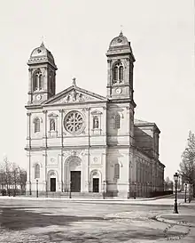 The site chosen for the new church was selected to fit into an intersection of Haussmann's new boulevards. The Boulevard des Invalides and a new boulevard were designed to cross the and to meet the Seine level with the Pont du Carrousel. The new church was intended as the ending point of the new boulevard, Tthough the work was not entirely carried out as intended. The construction was begun under Abbé Jean-Louis Roquette, with architect Adrien Lusson in charge. It was halted for a time in 1861, then resumed by architect Joseph Uchard.[1]